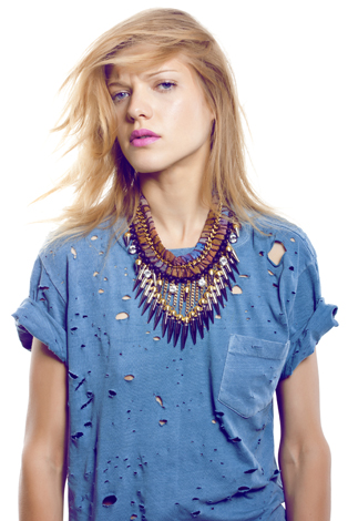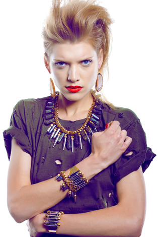 I think what won me over is the combination of materials–a fusion of organic materials and spikes and chains (which I of course love), which she calls “bohemian with an edge.”