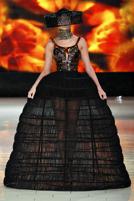The collection is opulent and ultra-feminine, with an edge. Burton managed to combine fishnets, petticoats, and luxe beekeeper hats and somehow make it all seamlessly fit together.