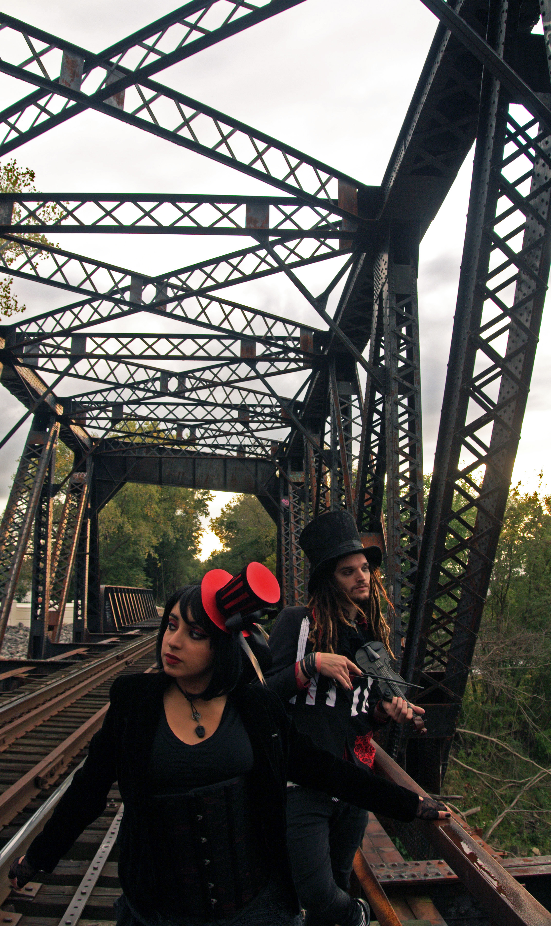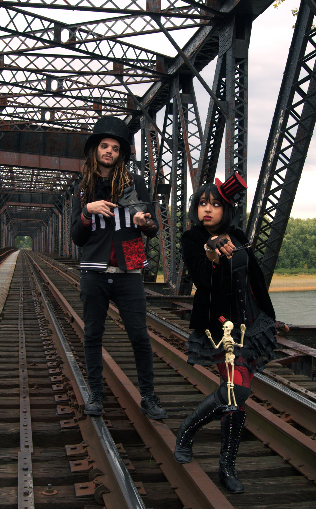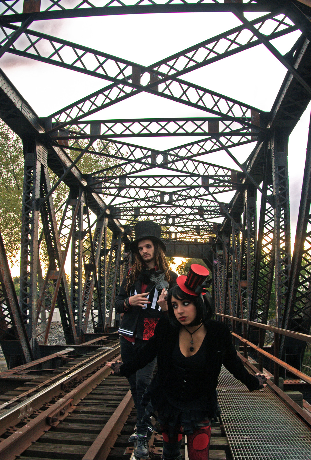 The inspiration for every shoot starts with a single piece. I picked up a three-tiered bustle burlesque skirt at an epic shop in Chicago–brimming with corsets, top hats, wigs, theatrical makeup–that I sadly can’t recall the name of. But as soon as I picked up the skirt, I knew I wanted to create a duo of dark, circus-y traveling goth performers.