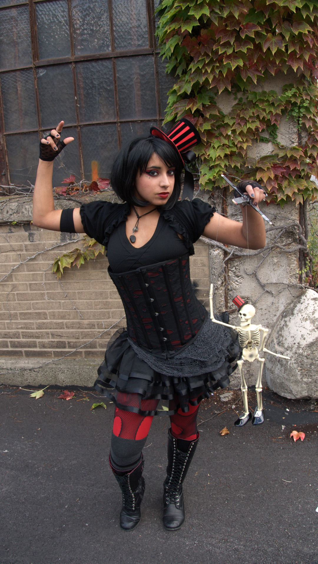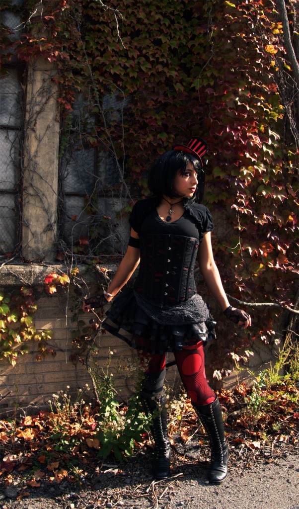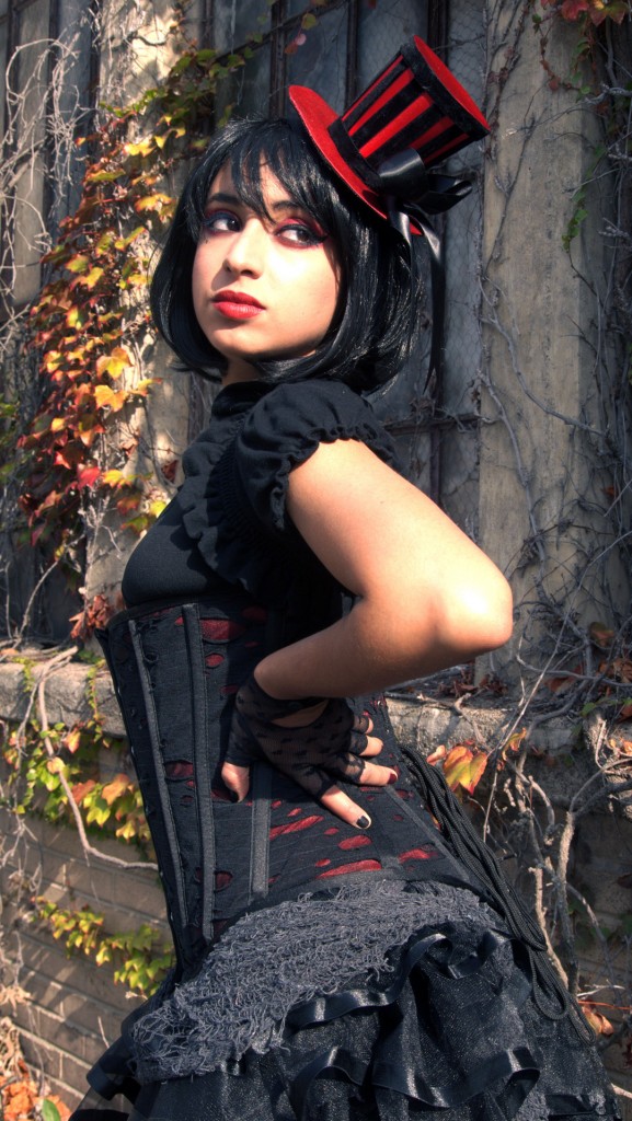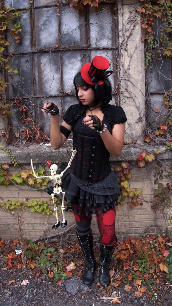 The necklace and skeleton marionette were handmade by me, and the bustle skirt has “creepy Halloween fabric” (yes, that’s what it’s called) layered on top. Now, here are all the deets… Corset – Heavy Red; Velvet Blazer – Iron Fist; Boots – Abbey Dawn; Top hat – Leg Avenue; Wig – Gothic Lolita Wigs; Lipstick – Lime Crime; Eyeliner – Estee Lauder; Eyeshadow – Rebel by Bloody Mary; Gloves – Hot Topic; Ruffled Shrug, Skirt, Tights – off brand.