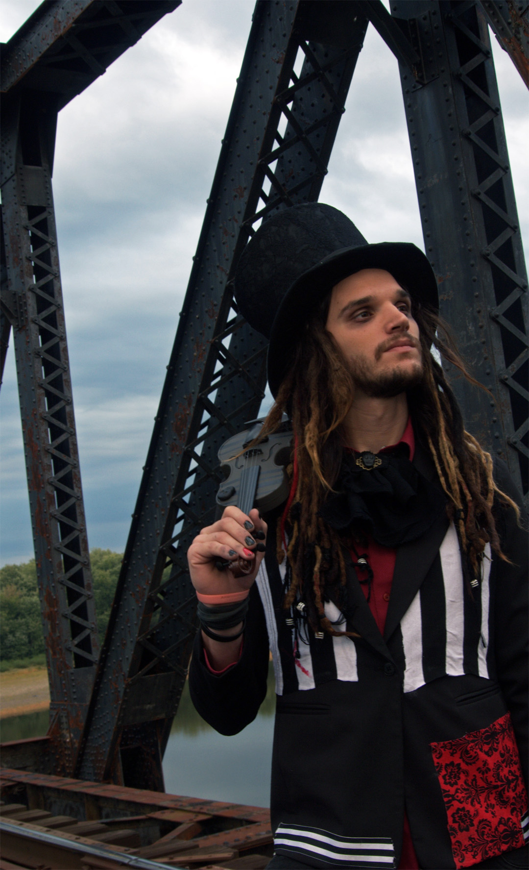 Everything on my other model, Dennis Condusta, is off brand, with the exception of the thrifted blazer, which he altered with stripe and brocade accents. I painted his black and gray striped violin and made a filigree skull jabot (the ruffled collar, for those of ya’ll who ain’t up on your neckwear terms).