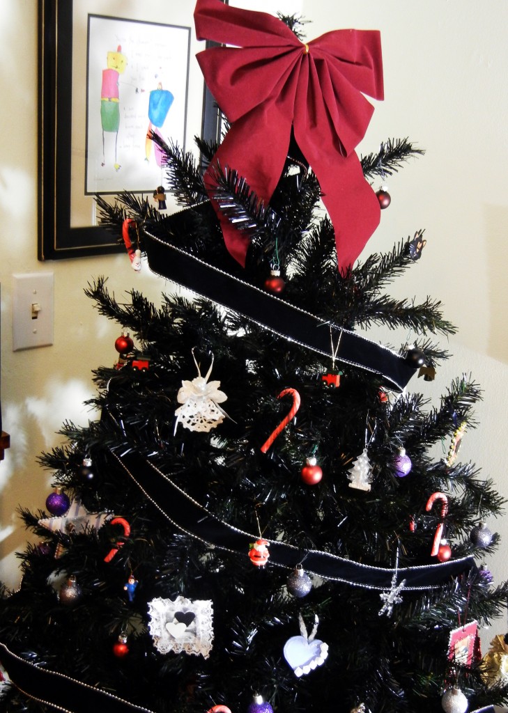 I spray painted my Christmas tree black this year (#GothicChristmas), and managed to both fail and succeed at the same time. In this picture–FAIL. With the patches of green peeking through, who would’ve known I’d already gone through three cans of black spraypaint, only to have to abort my mission due to an insanely painful hand cramp. Well, we’ll call it a work in progress. Three more cans next year and that should just about do it, I suppose…