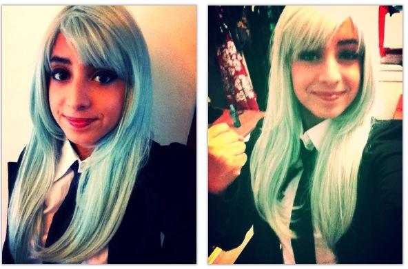 If you aren’t afraid of a little wig styling and maintenance, might I recommend AliExpress.com and eCrater.com. Here I’ve found high-quality heat-resistant wigs for super low prices ($10-15 range), but the hitch is that the wigs often come unstyled–I’m talking super long, no bangs, lacking distinctive shape. When I purchased it, this teal wig was primarily all one length with long bangs that covered my eyes. But I went for it because it was only $12, and after one quick haircut, it was perfect. And if you don’t trust yourself to style a wig, it may sound funny, but ask a hairstylist you know to give you a wig “haircut.” That’s what I did.