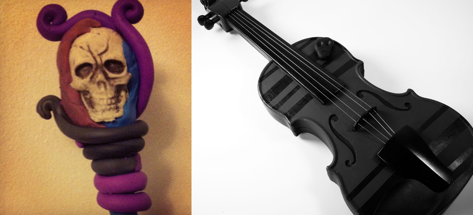 Nine times out of ten, this is the category I fit into. I’ve never quite mastered sewing an entire outfit, but I can make hand-sewn alterations like nobody’s business, and I love taking cheap, low-grade Halloween props and transforming them into something epic. Two weeks from now I’ll be attending the PA Renaissance Faire and I’ve recently been working on a dark sorceress costume. The first image is an early progress picture of the wand I made. The picture was taken before I baked the clay and painted it, so believe me, it no longer has a weird Skeletor color scheme, but I’ll wait until the entire costume is complete to show the final project. Next to it, the violin started as a silly looking children’s toy and after some paint and clay, turned into a classically spooky prop for one of my past photo shoots.