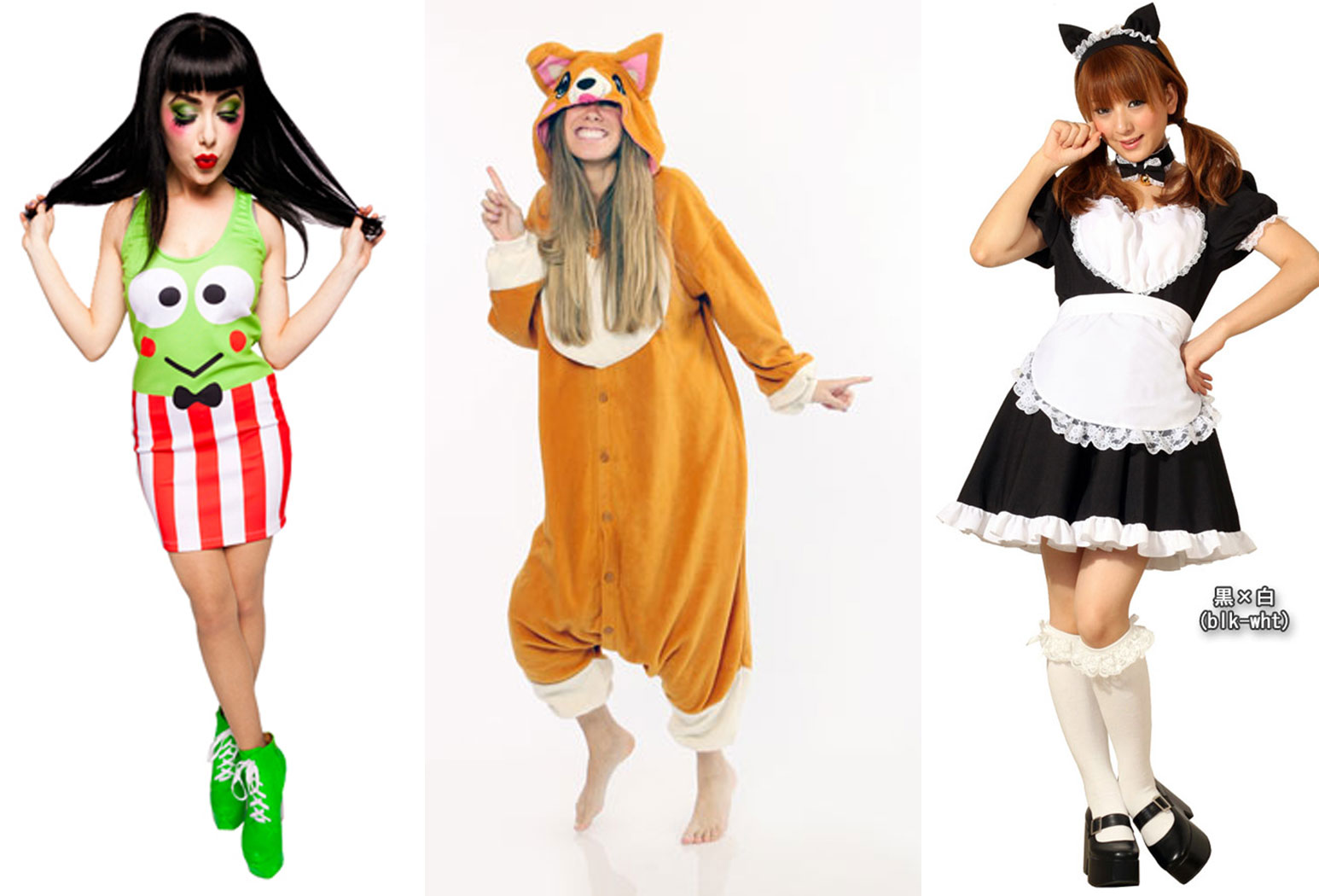 Here are a couple of ready made costumes that actually made me think “yeah, okay, that’s actually not terrible.” The Keroppi costume is my all-time favorite since it does double duty as a costume and a super-cute casual dress, and the kigurumi suit and kitty maid costumes would also be perfectly fitting for an anime convention or comic con.