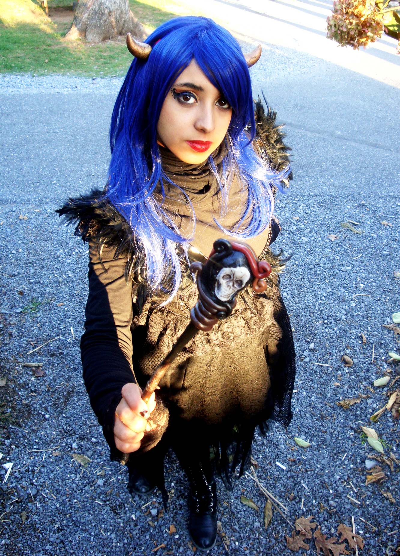 It was absolutely (and unexpectedly) freezing when we went, and I had to make a few alterations to my costume–I piled on about 4 tops, a scarf, and two pairs of leggings not originally planned. As for the small costume details, I built my wand using wooden stick, polymer clay, plastic skull Halloween decoration, acrylic paint, and Mod Podge glaze. For the horns, I molded modeling clay and affixed it onto hairclips, then painted them with three shades of metallic acrylic paint. Here’s a picture of the wand, pre-paint job.