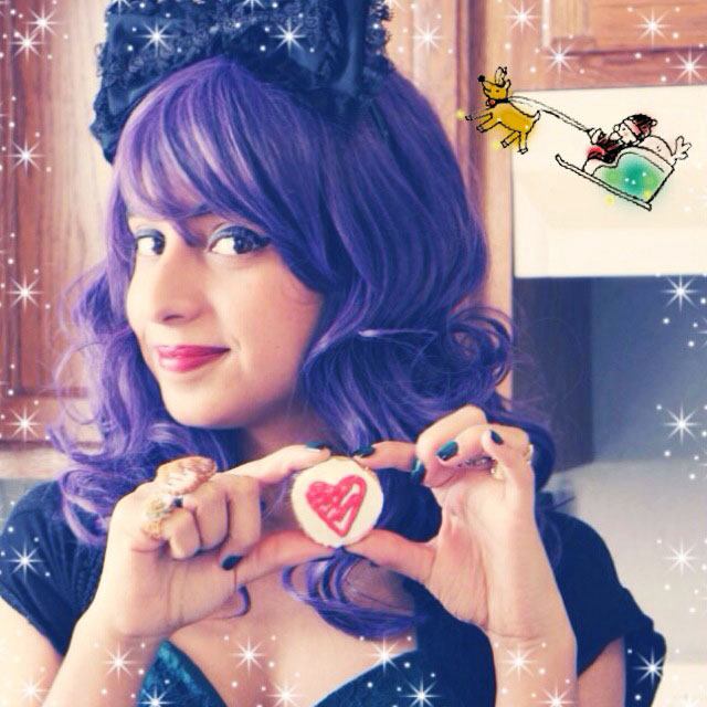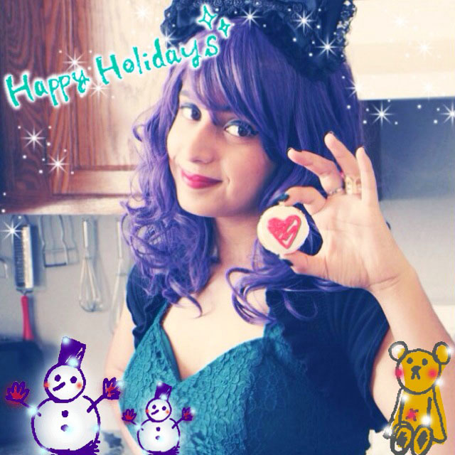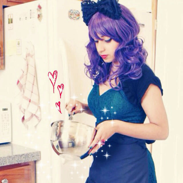 The wig is from Gothic Lolita Wigs, the dress is vintage, and the hairbow is from Rakuen. The shrug is offbrand, my apron is handmade, and “Maybelline Color Show Nail Falsies” (seemingly no longer available, according to Maybelline’s site) allowed me to pretend I had lovely nails for the day.