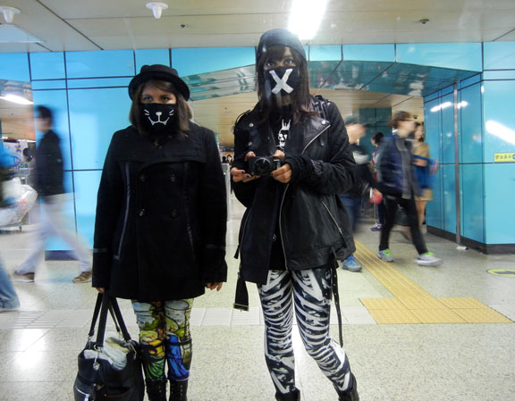 Sleek, long line coats are absolutely everywhere you turn in Korea. I picked up this offbrand jacket and my felt hat in Hongdae, Seoul. My skeletal Totoro bag is from an amazing hard-edged otaku brand, Fiend or Fauxx, and my boots are Nine West.