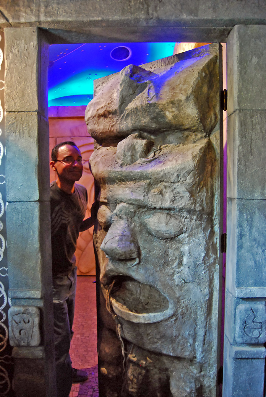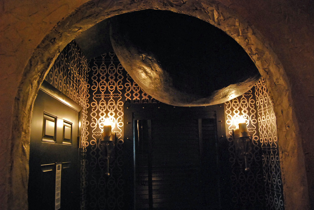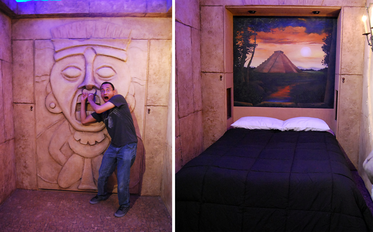 202924Although it’s the smallest of the three rooms, the secret bedroom is by far the most impressive. The door to the room looks like a stone carving that’s simply part of the house’s overall decor. Had we not first read about it on the website, we probably would have never thought to pull the level that revealed the room inside, which features a pull out bed and a fluorescent ceiling painted like the evening sky.1