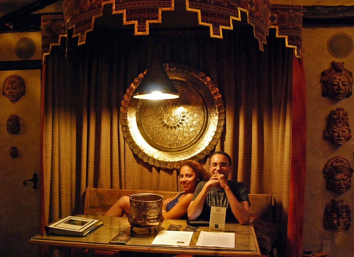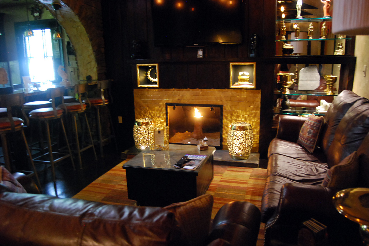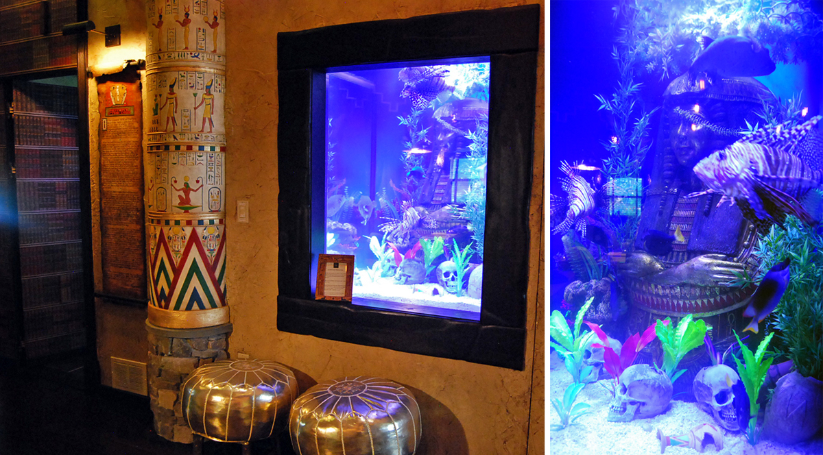 The living room features an electric fireplace and shelves stocked with replicas and artifacts. The entire space is peppered with archaeological “finds” such as masks, books, and gold coins. The attention to detail actually makes it pretty difficult to determine what’s fake and what’s real. The hallways of The Digs resemble a library, featuring information to unlock the mysteries of the things you’ll find. Certain items in The Digs actually have their own legends and stories attached, such as the skull wine decanter and the fishtank.